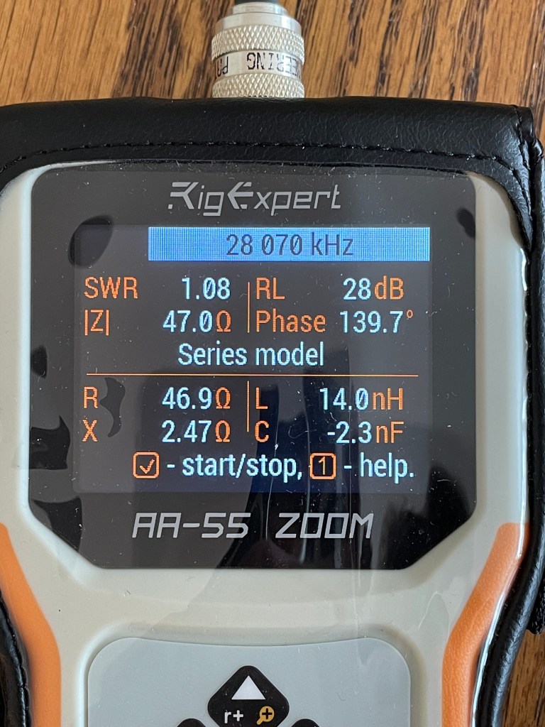 I managed to get my whip antenna tuned to around 1.08 SWR near the FT8 calling frequency on the 10-meter ham band which I was surprised with to be honest. I had the whip set up on a small tripod (still considered ground-mounted in this case) and tossed on five short 6′-7′ strands of radial wire.