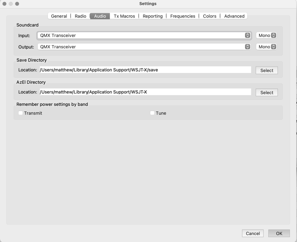 Make sure that you have your QMX wired up, powered on, and connected to your computer. Once that is completed, launch WSJT-X. Enter the Settings menu for WSJT-X and navigate to the Audio tab. The first thing we want to do is set the Input and Output audio source to be the USB device that is the QMX. The way this appears will be different depending on which operating system you use on your computer. As audio settings can be very unique for each computer and operating system, I am unable to provide guidance on those in this article. The examples here are from macOS.