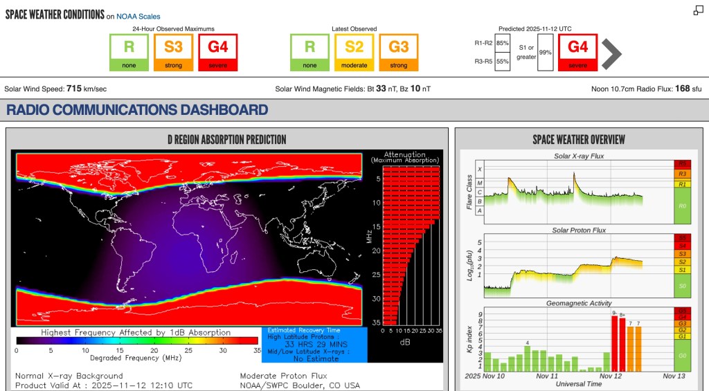 What a week for amateur radio, huh? I counted three CMEs that hit us this week in a matter of just a few days. These caused severe geomagnetic storms that made operating on the ham bands a bit trying and almost entirely put a stop to DX possibilities for a bit. Some lucky folks in northern latitudes who have darker skies were treated to an aurora showing as these passed over us. It must have been nice to see that.
