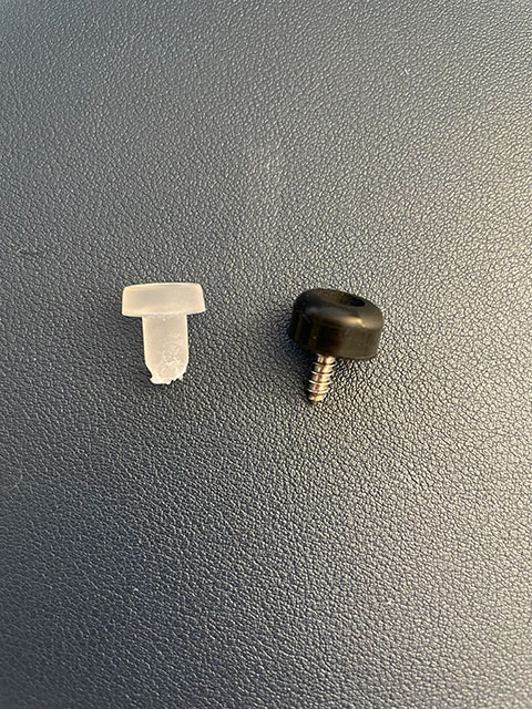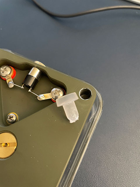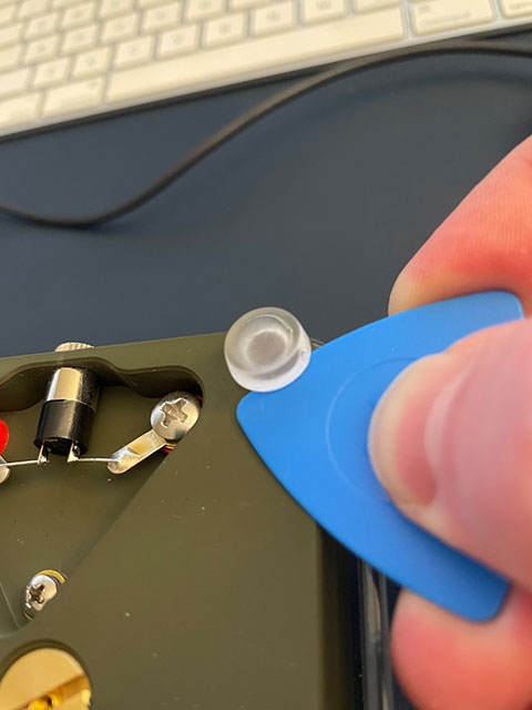 As I was so pleased with the black rubber feet on the other paddles I own, I searched for a suitable set of feet that I could swap onto the Begali. Since the base of the Begali is not tapped to accept screw-on feet, I originally searched for something that could just glue on in place of the existing feet. While taking one of the original feet off, I realized that there are holes in the bottom of the base and the feet are pressed into there and held in place by a dab of glue of some sort. They are easy to pry out using a plastic spudger. This presented some problems since I now thought that I’d need a foot that could press into the hole in the base. But then I had an epiphany. Why couldn’t I use a screw-on rubber foot and secure it in the unthreaded hole in the base using hot glue?