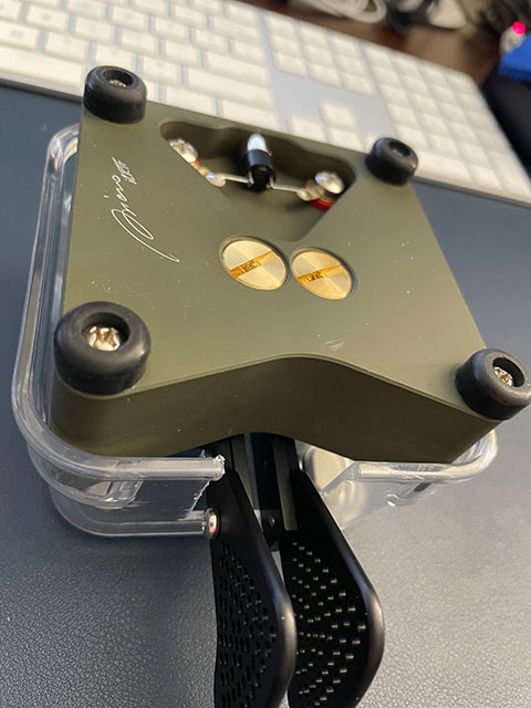 So, using a hot glue gun and some glue, I swapped out the original slippery feet for nice slip-resistant black rubber feet. Not only does the black rubber fit in well with the rest of the color motif of this paddle (black hardware on a military matte green base), the Begali Simplex Professional scoots no more! This was a quick, easy fix and I thought it was worth sharing.