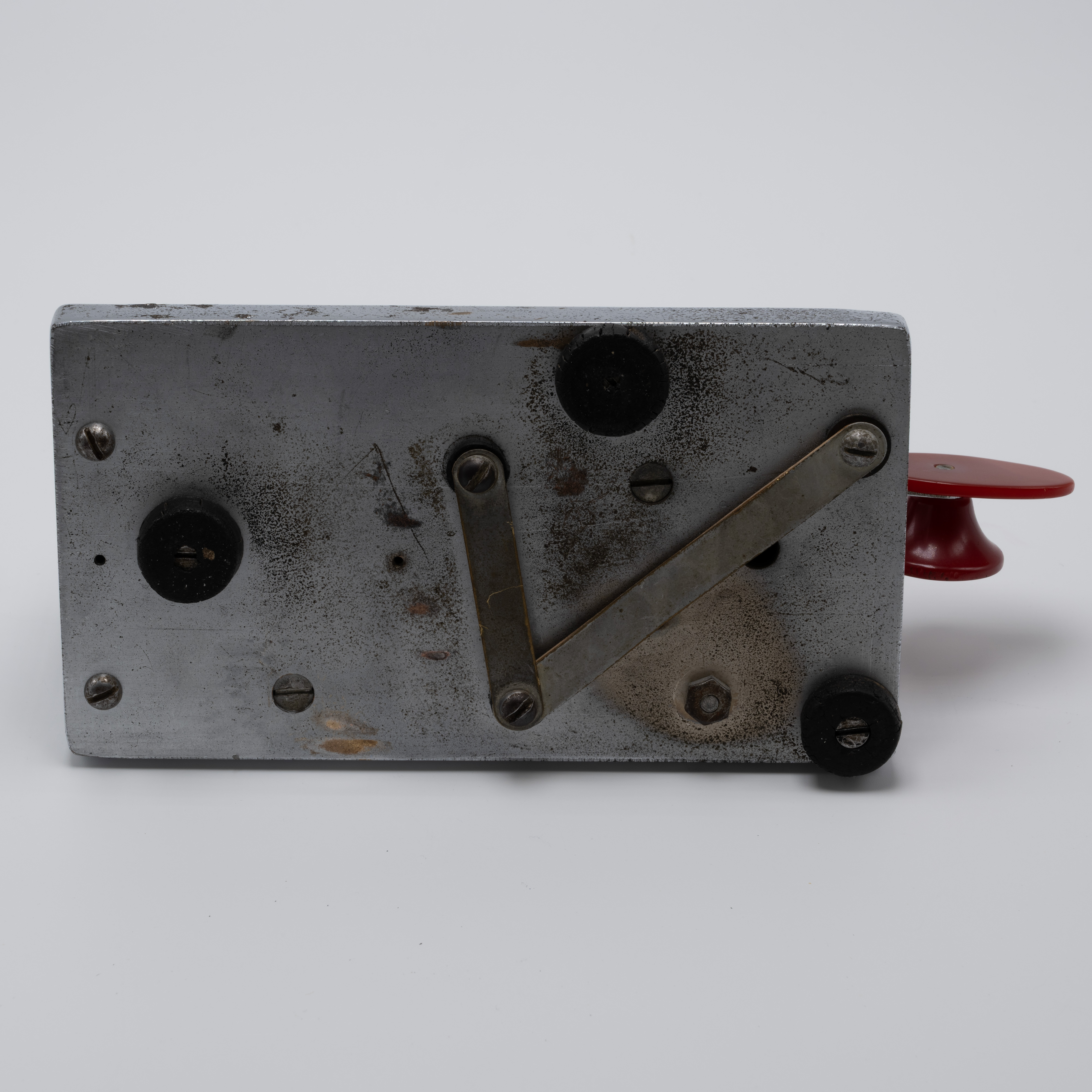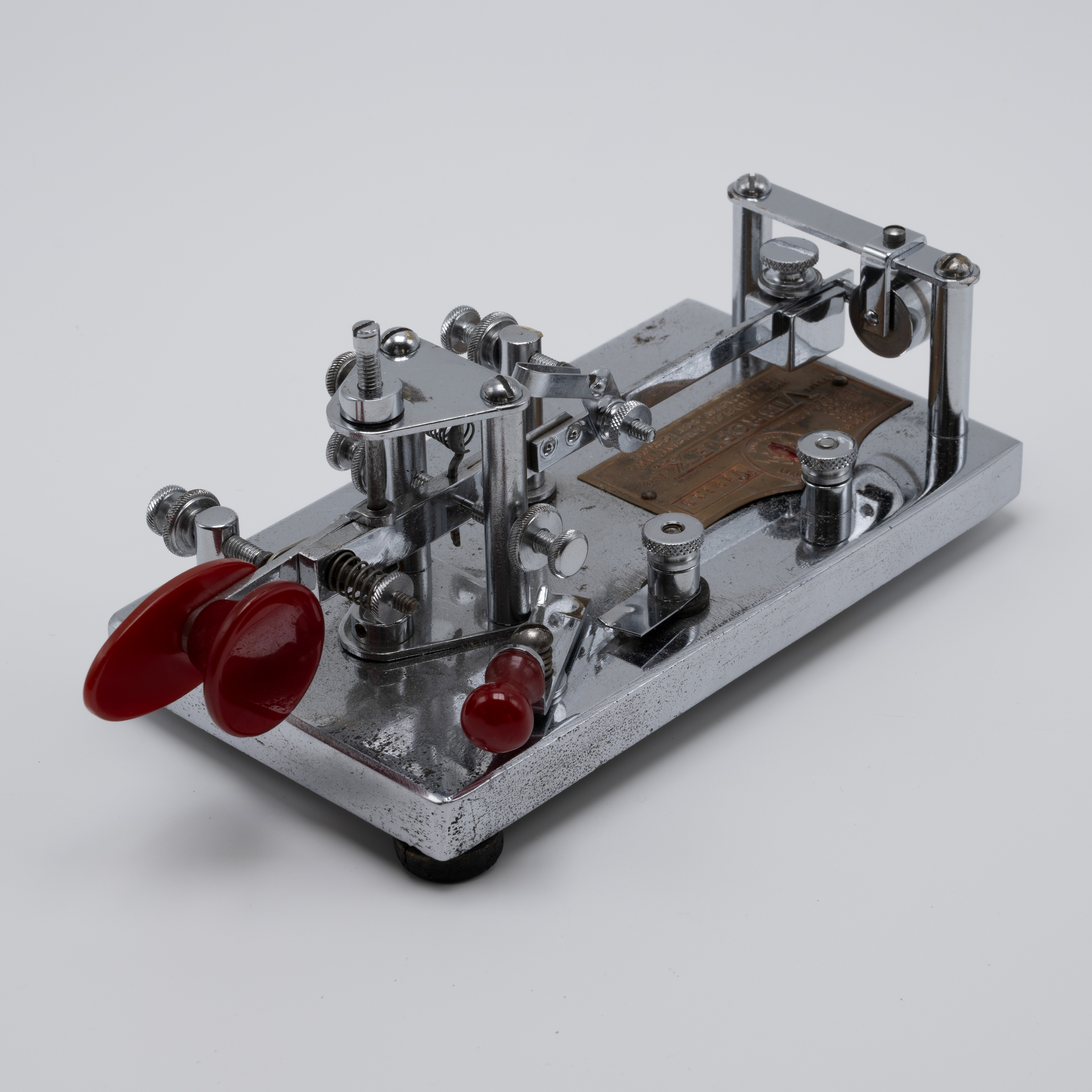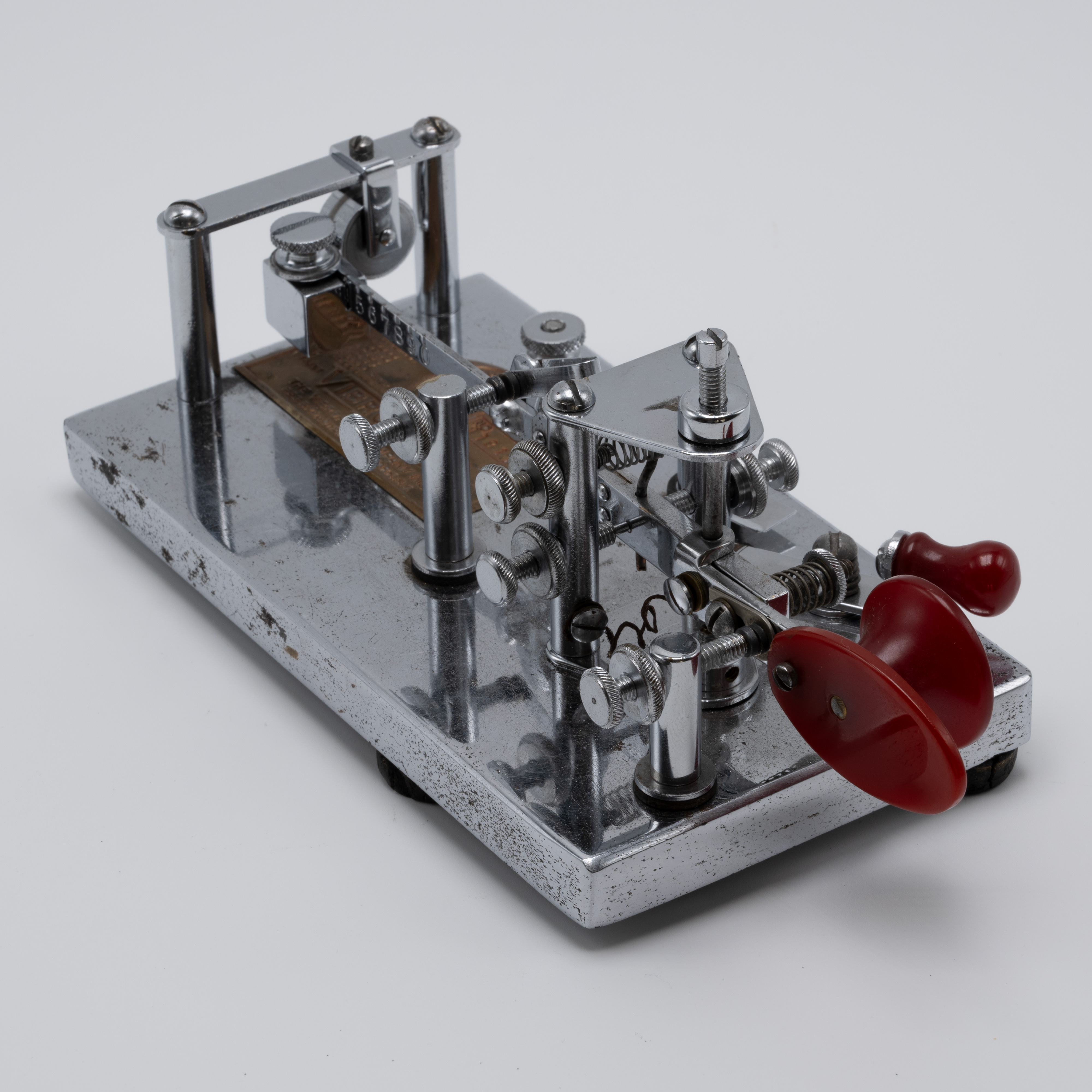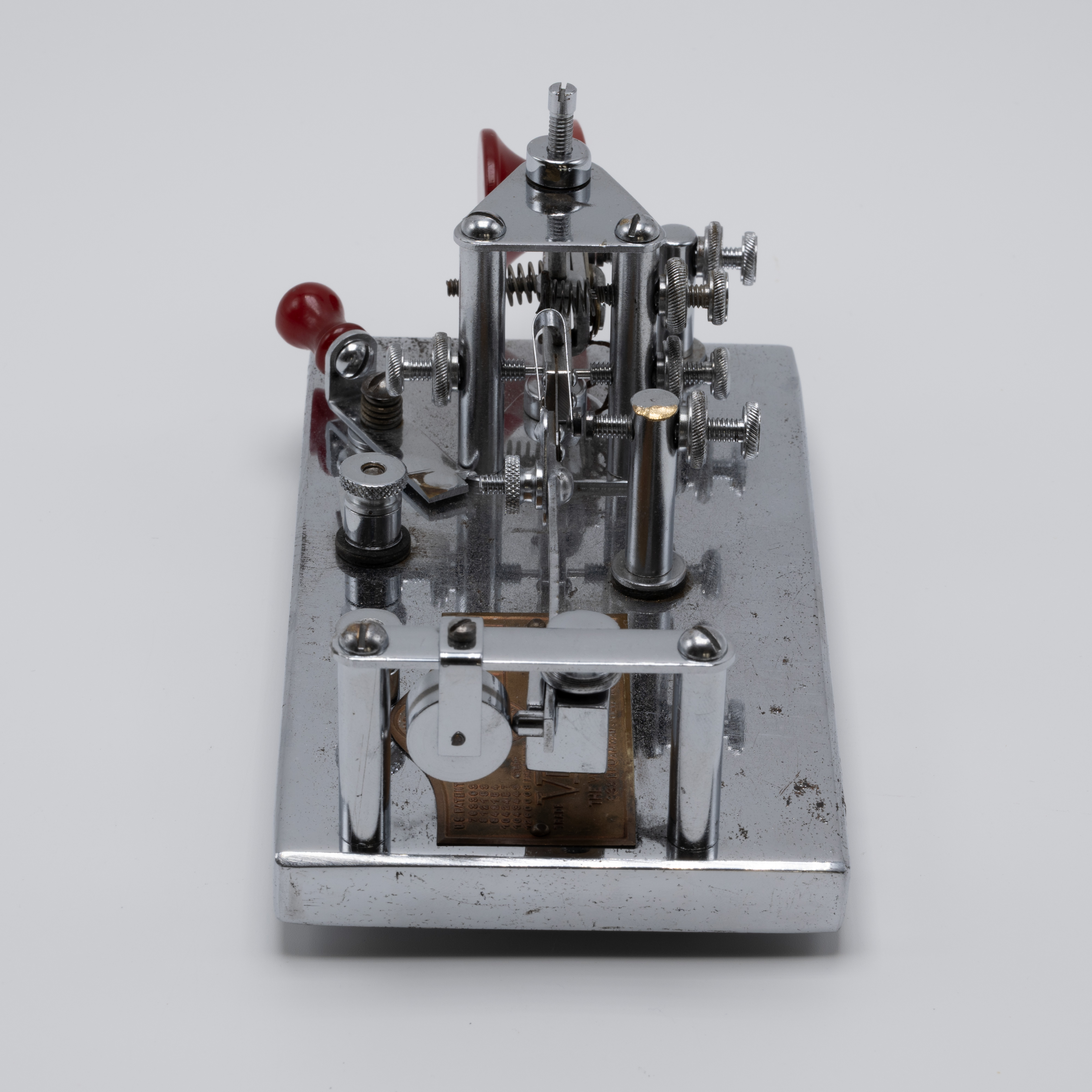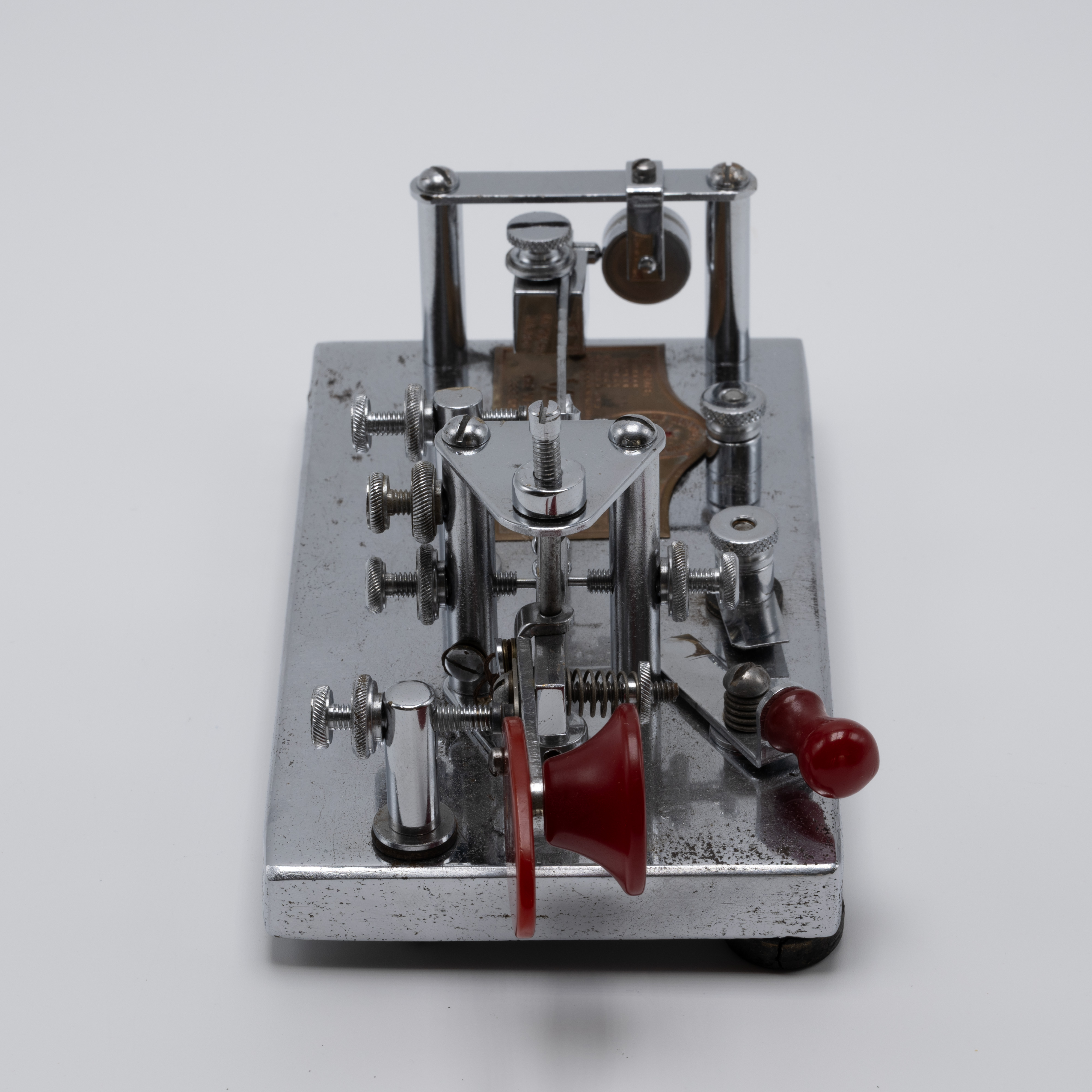 During the Second World War, the U.S. government required rationing of certain metals, which included chromium. With a majority of chromium being used to support the country’s war efforts, manufacturers were forced to find alternatives. As a result, the Vibroplex company provided its Deluxe model bugs with a “Battleship Gray” crackle base instead of the usual chrome-plated base. These bugs would retain the same jeweled trunnion screws and bright, deluxe top parts and red finger pieces. As soon as the war ended and the rationing of goods stopped, the chrome-plated bases returned, resulting in WW2-era “Battleship Gray” deluxe models for the Original, Lightning Bug, and Blue Racer being a bit of a collector’s item.