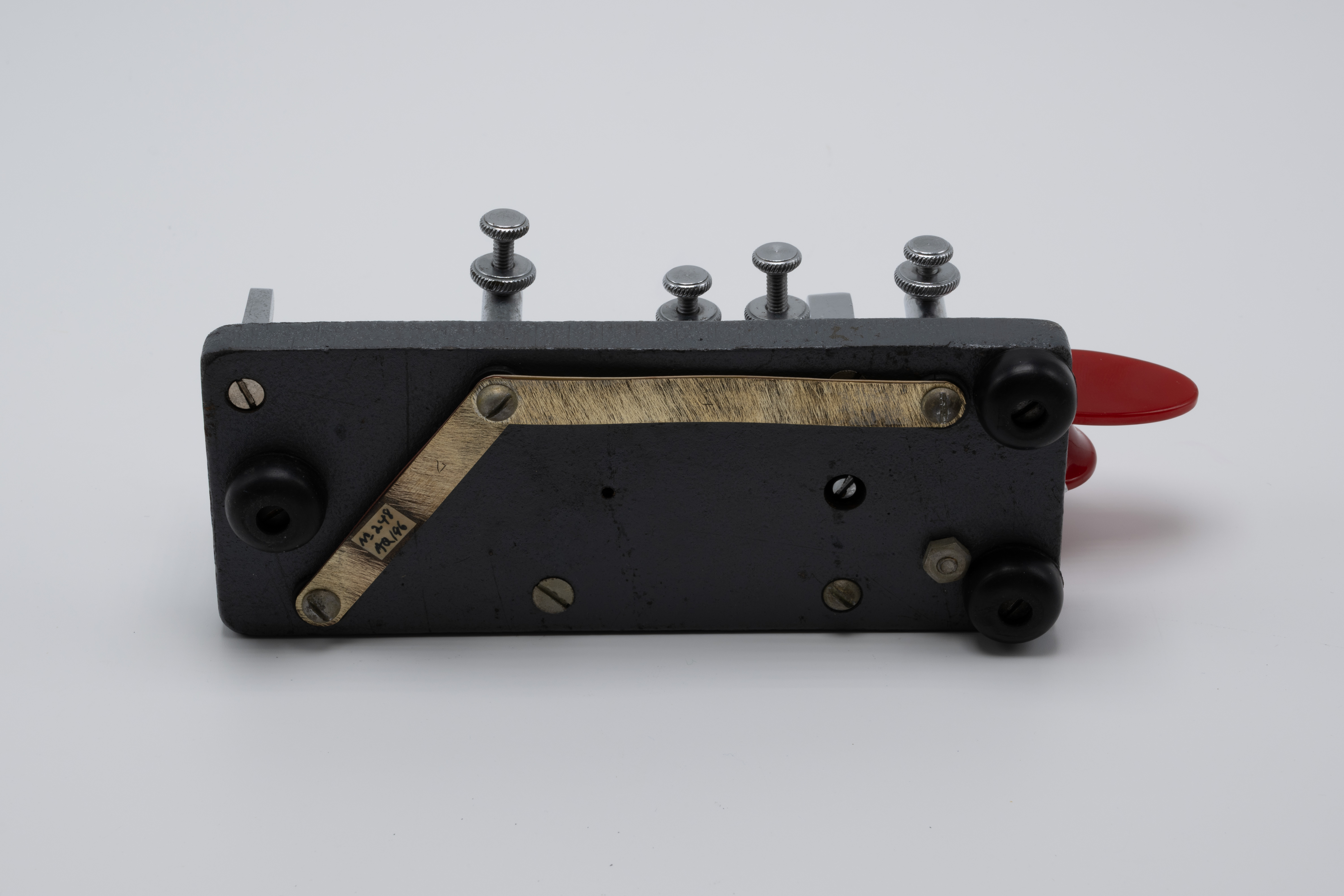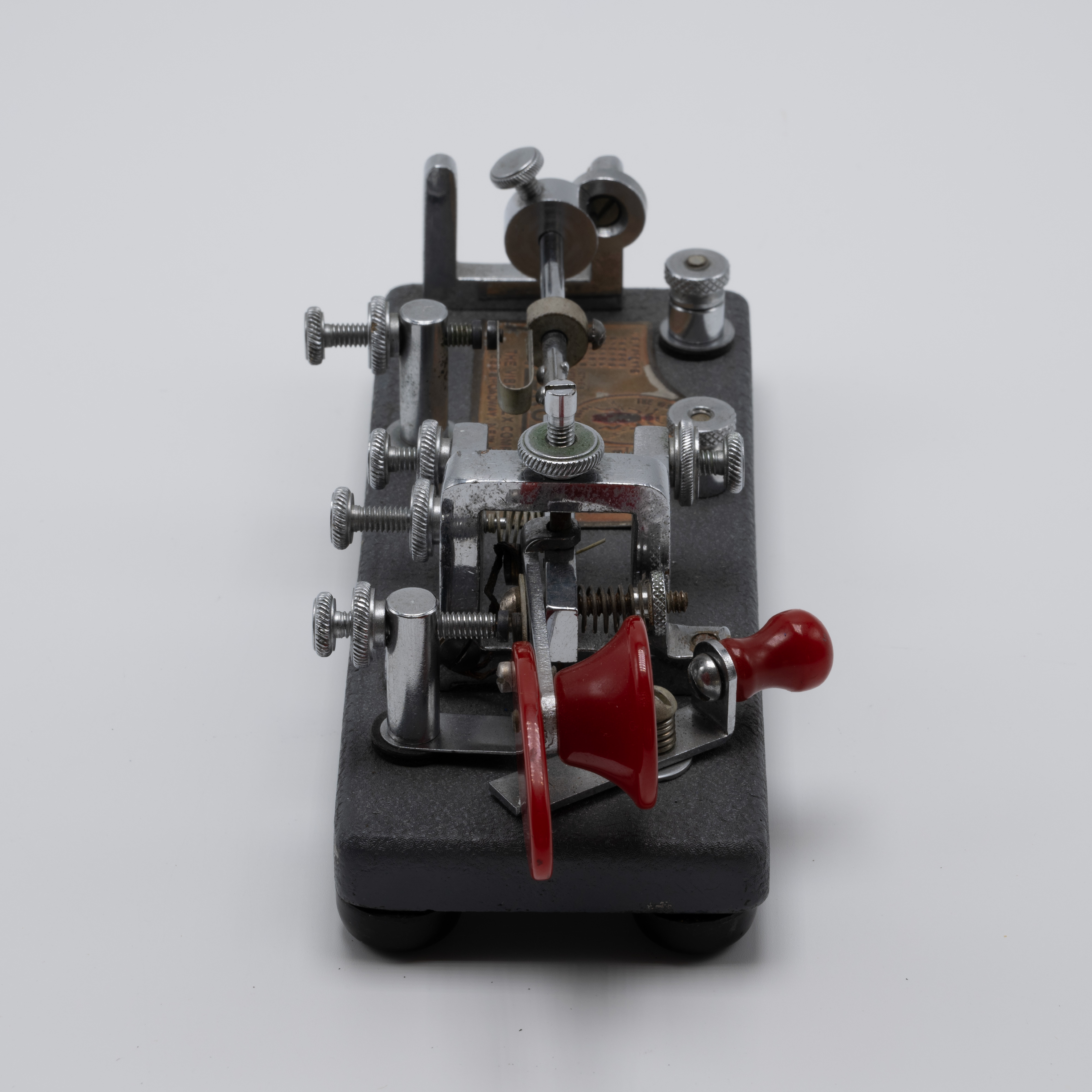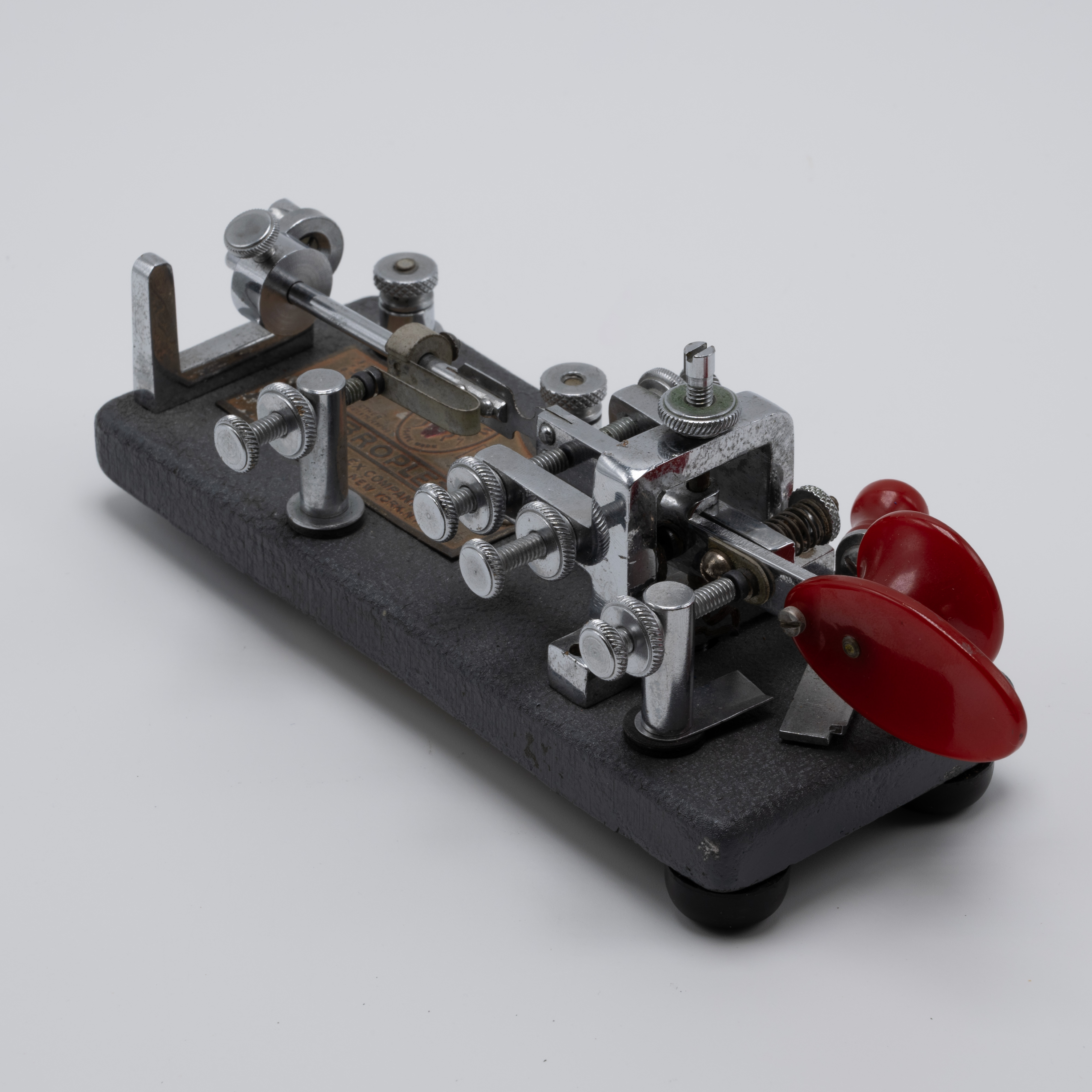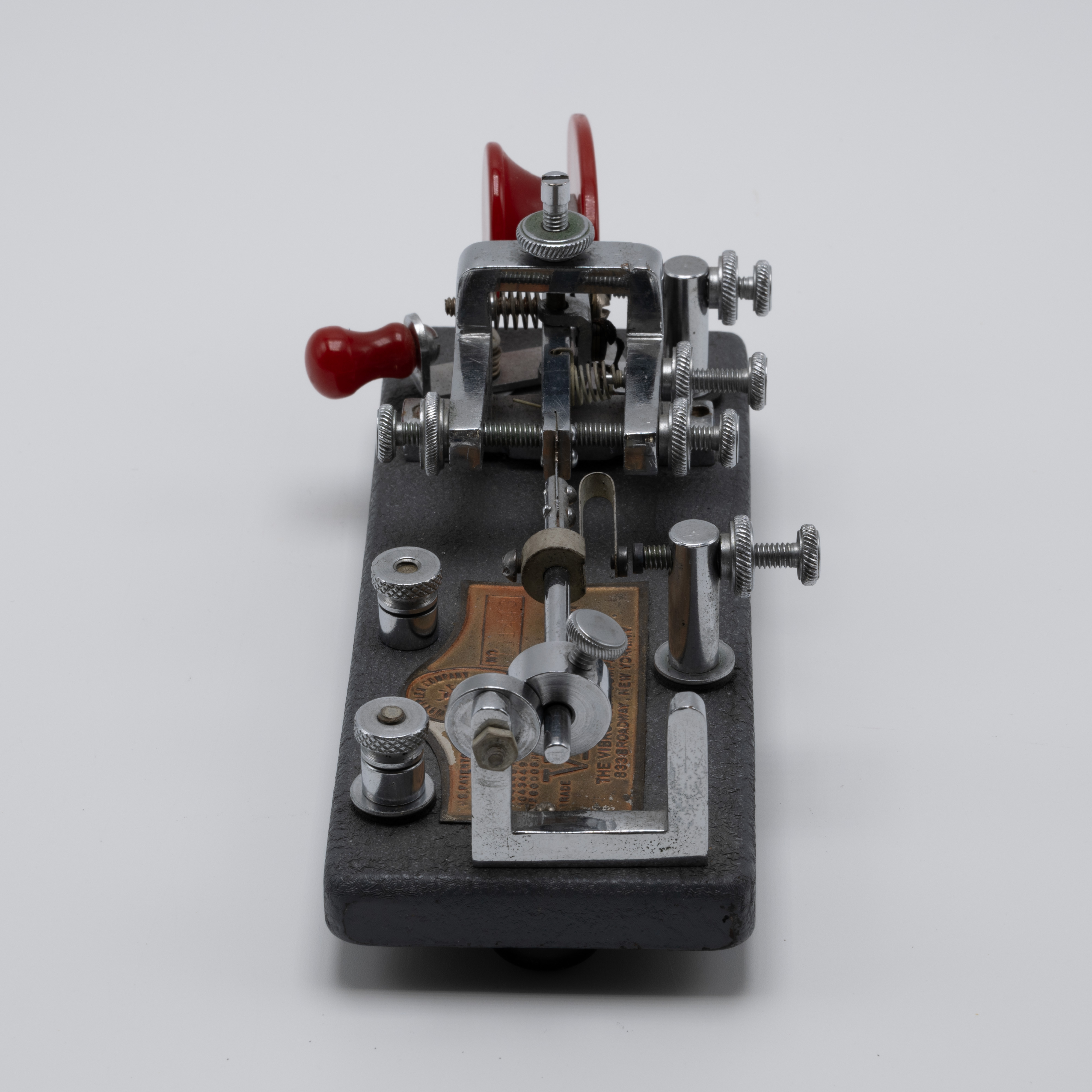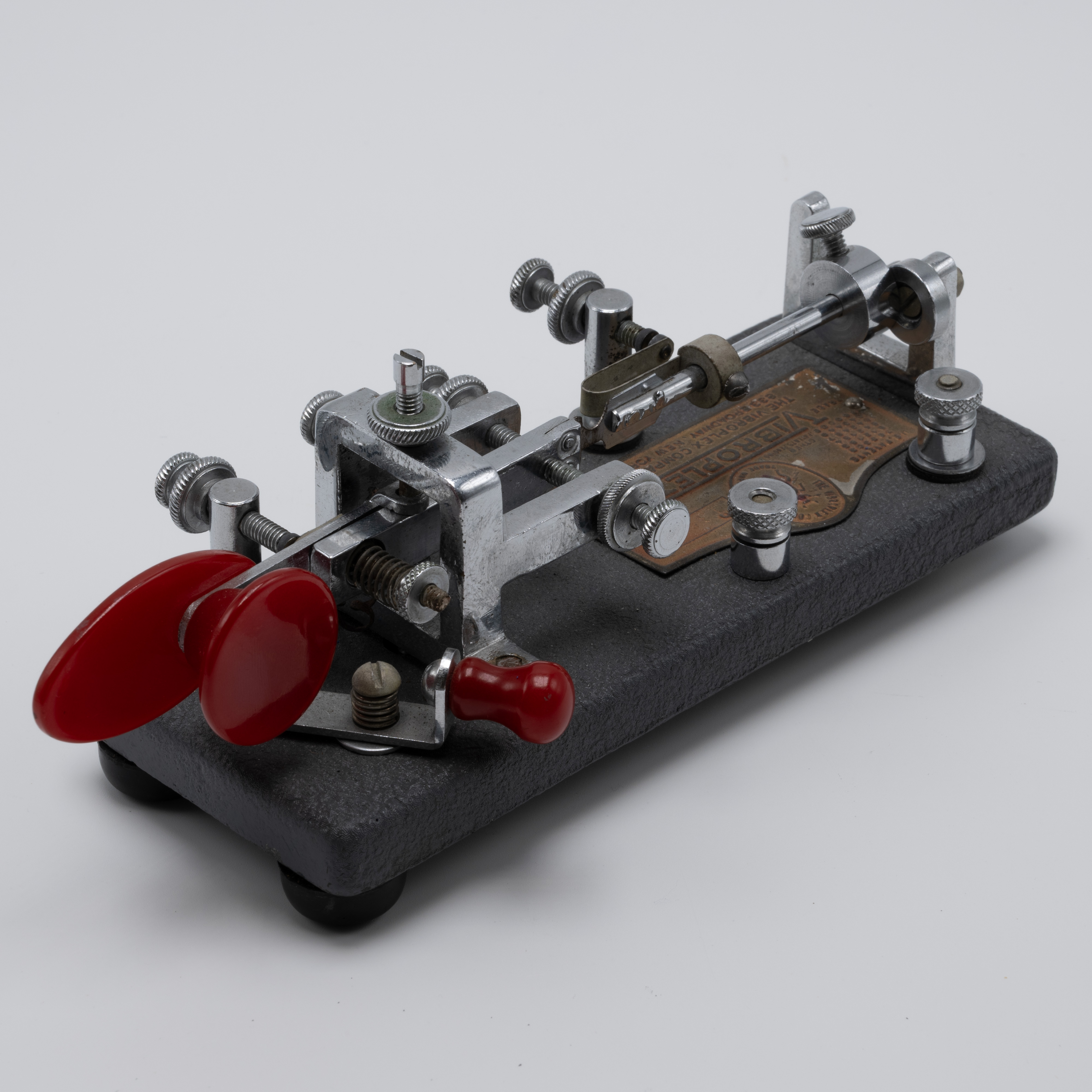 During the Second World War, the U.S. government required rationing of certain metals, which included chromium. With a majority of chromium being used to support the country’s war efforts, manufacturers were forced to find alternatives. As a result, the Vibroplex company provided its Deluxe model bugs with a “Battleship Gray” crackle base instead of the usual chrome-plated base. These bugs would retain the same jeweled trunnion screws and bright, deluxe top parts and red finger pieces. As soon as the war ended and the rationing of goods stopped, the chrome-plated bases returned, resulting in WW2-era “Battleship Gray” deluxe models for the Original, Lightning Bug, and Blue Racer being a bit of a collector’s item.