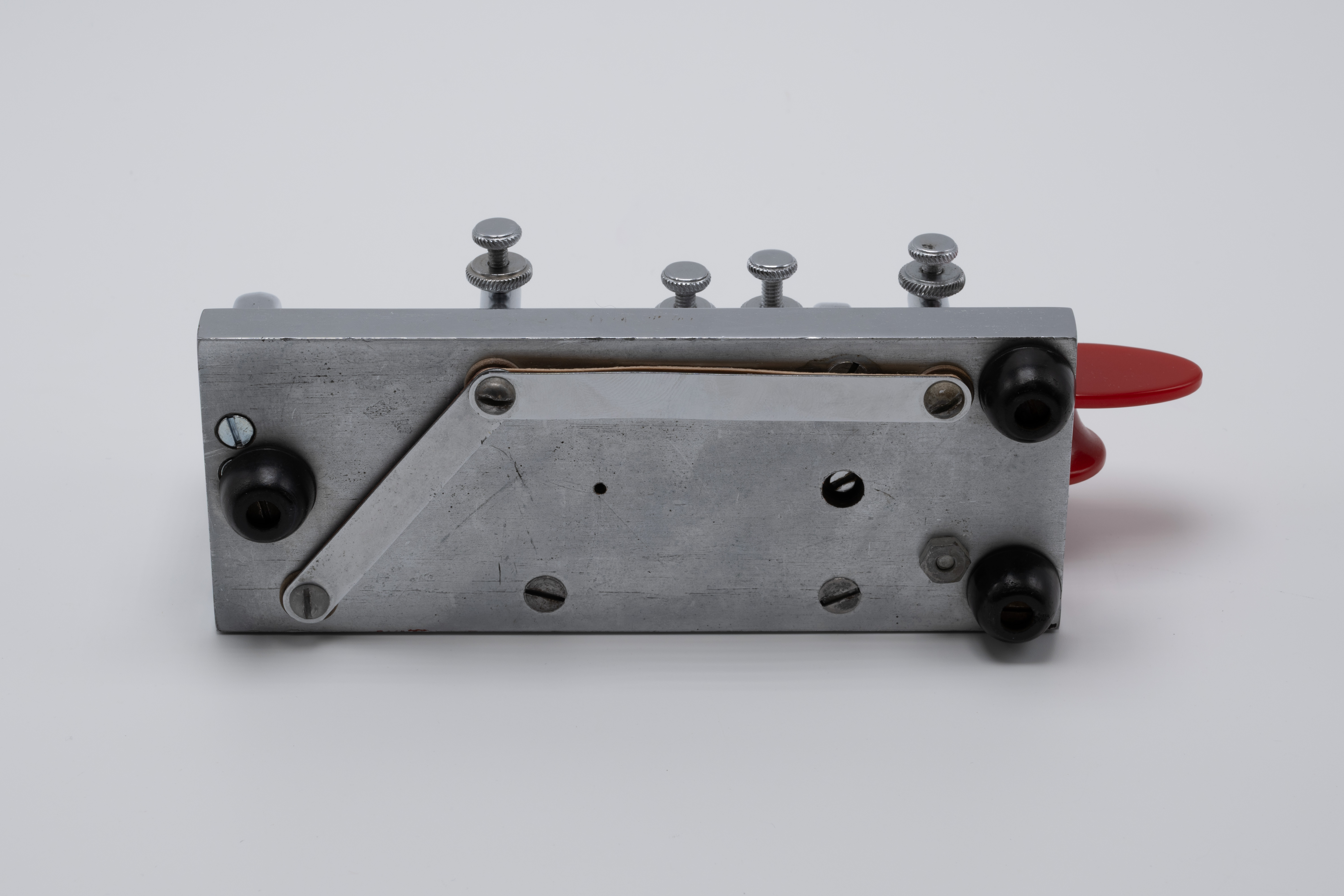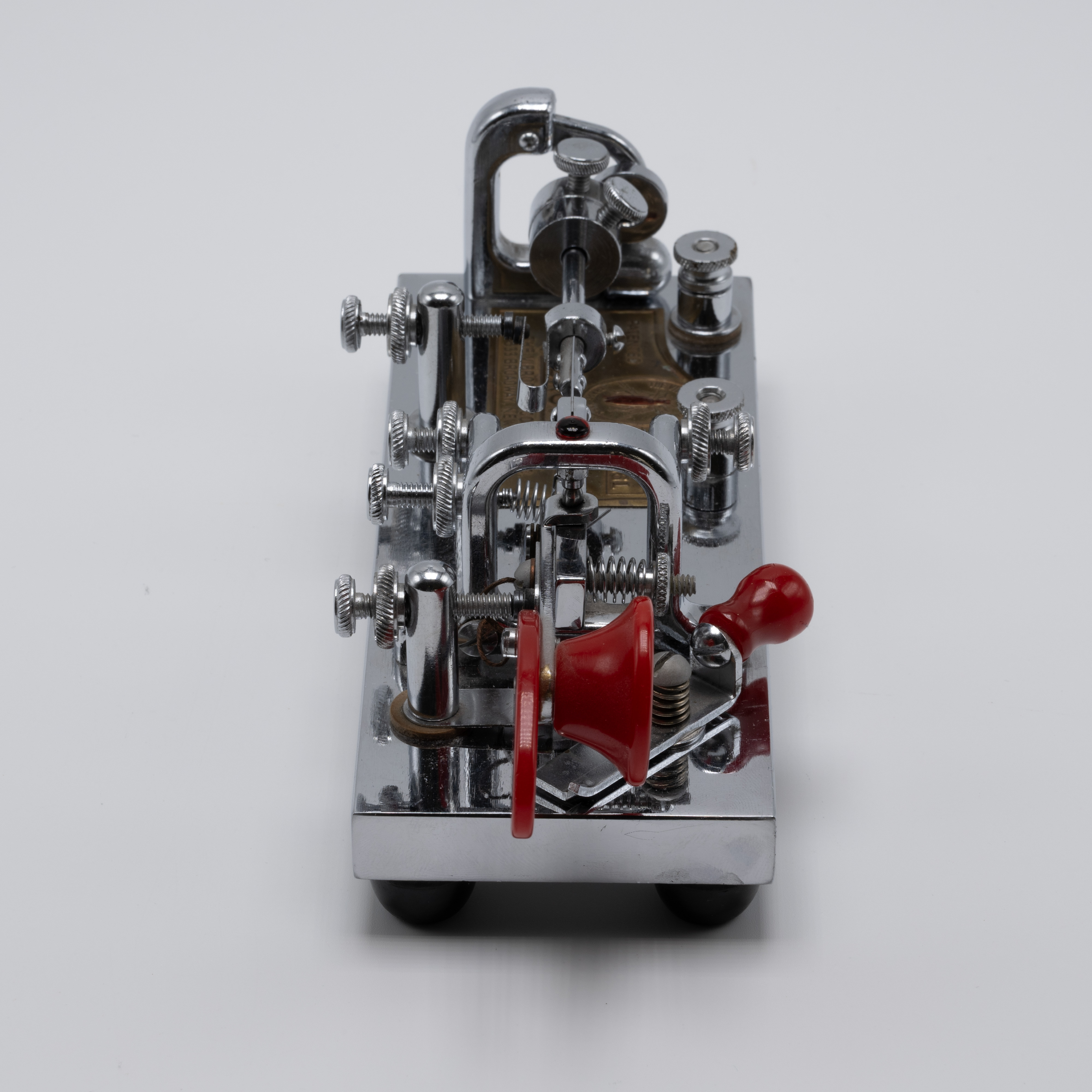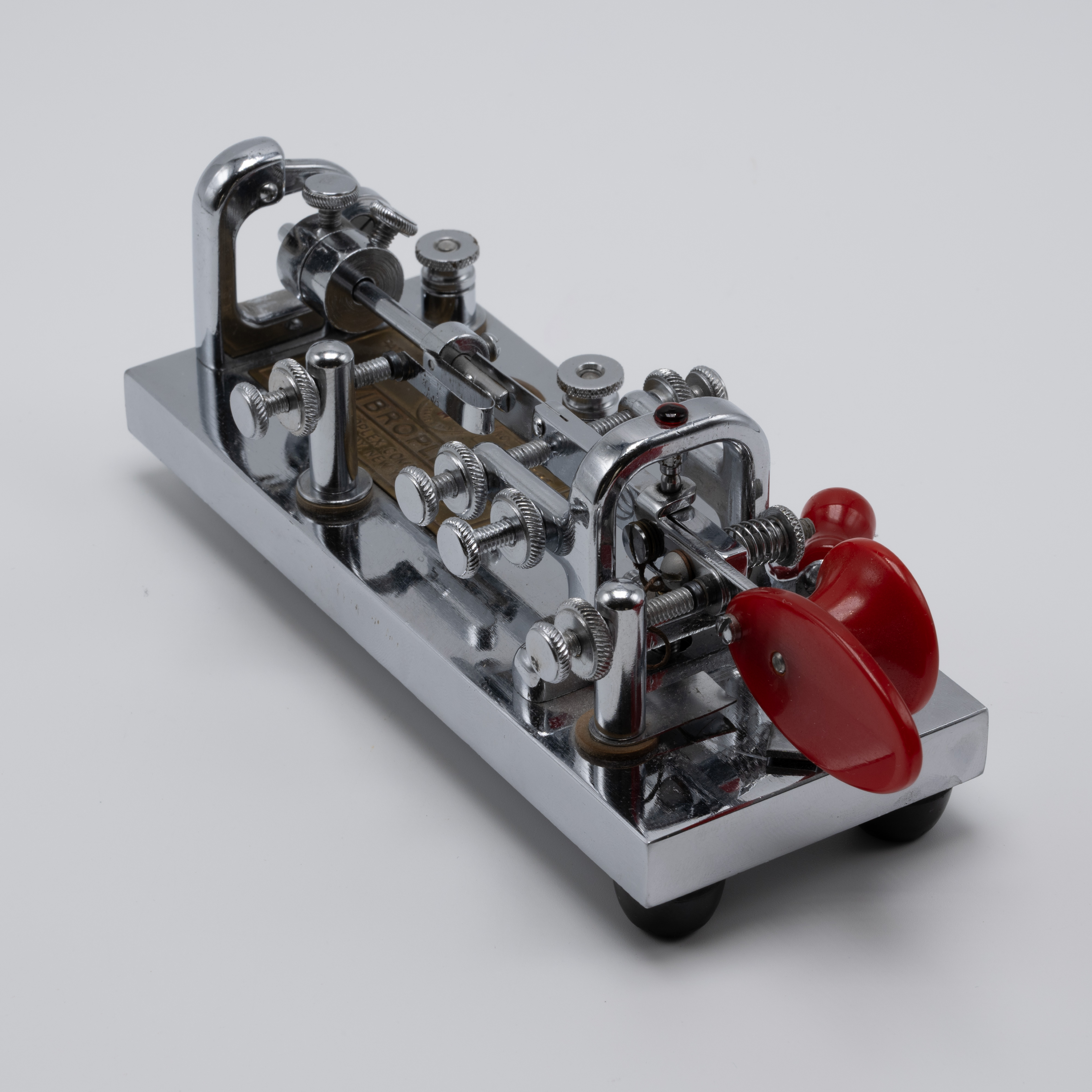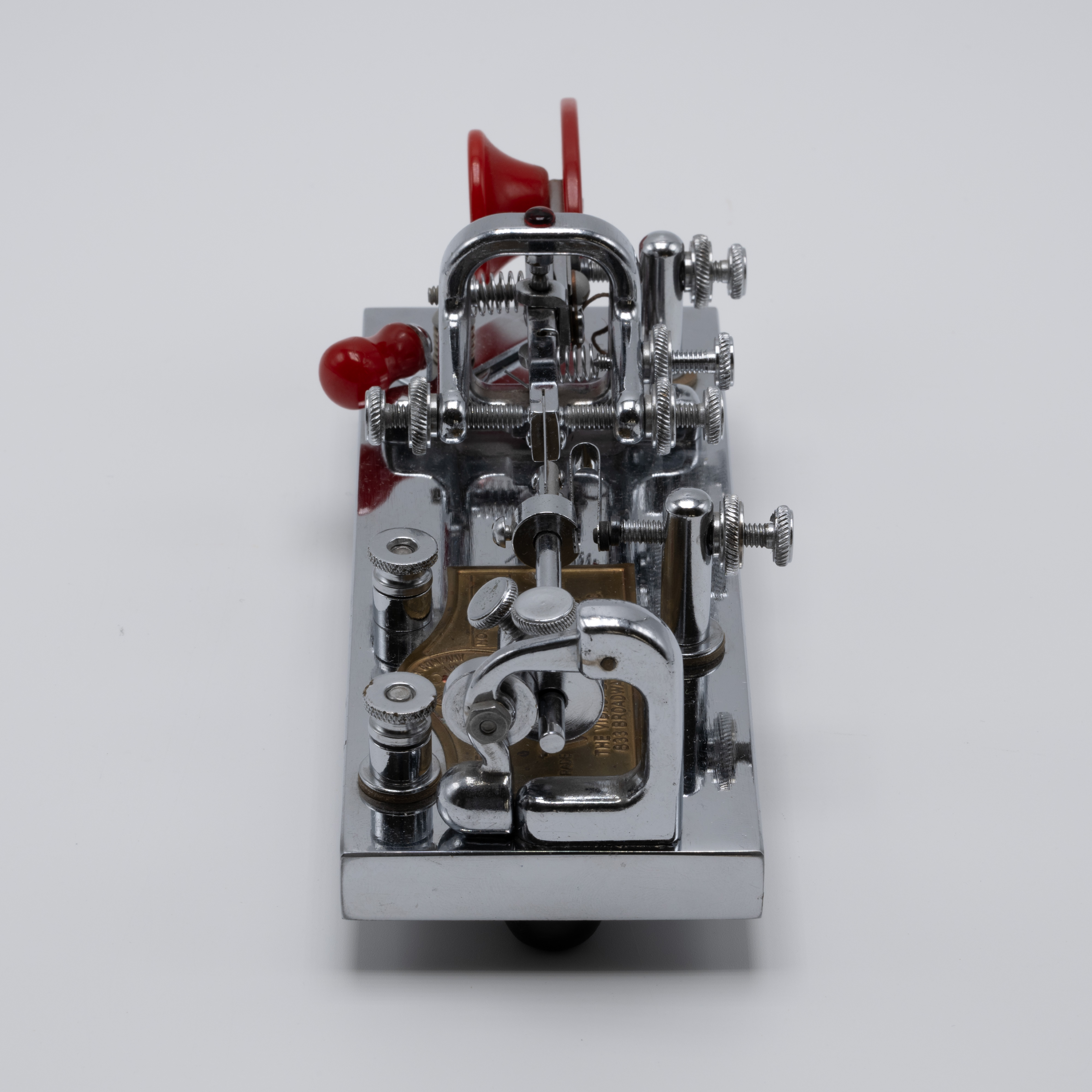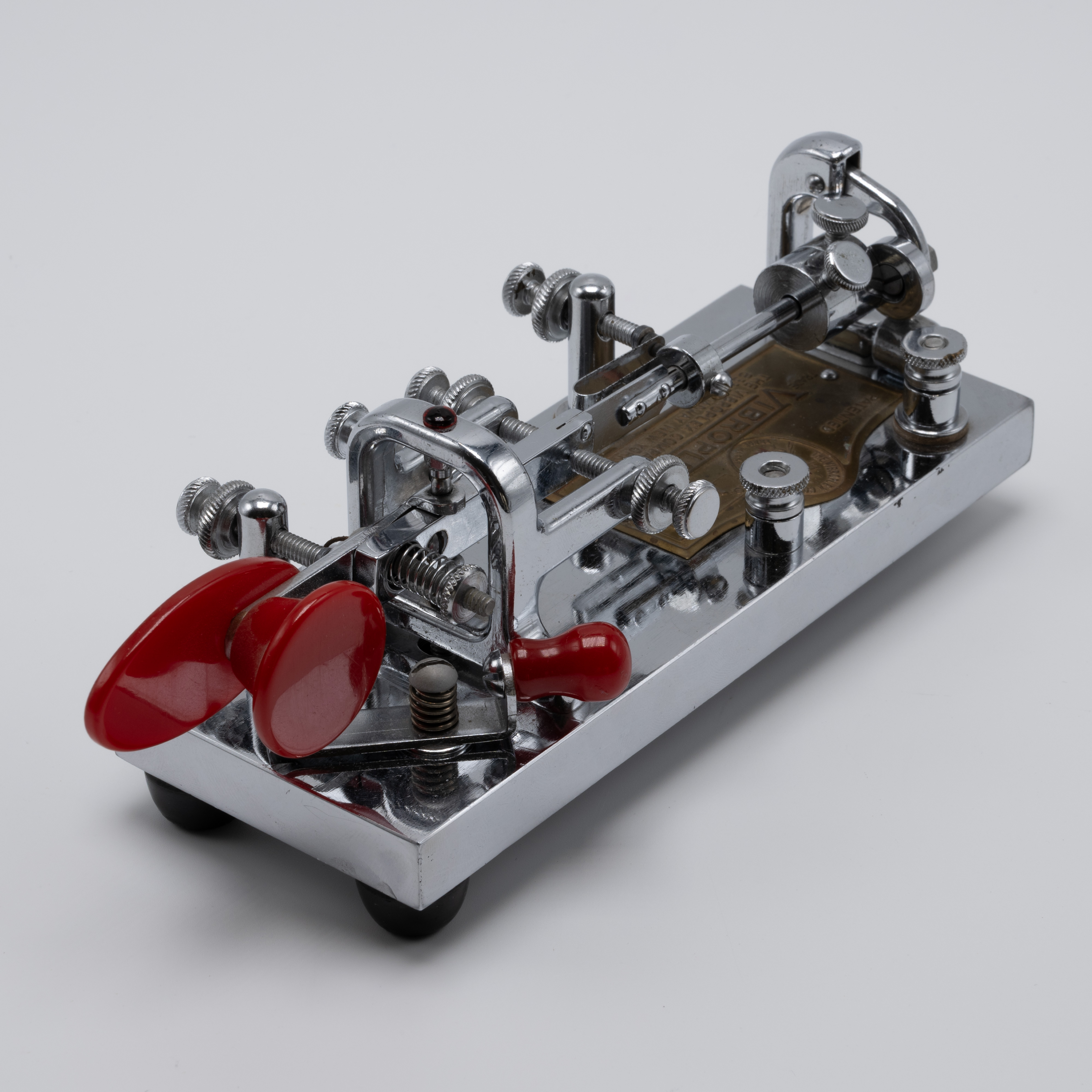 During the Second World War, the U.S. government required rationing of certain metals, which included chromium. With a majority of chromium being used to support the country’s war efforts, manufacturers were forced to find alternatives. As a result, the Vibroplex company provided its Deluxe model bugs with a “Battleship Gray” crackle base instead of the usual chrome-plated base. These bugs would retain the same jeweled trunnion screws and bright, deluxe top parts and red finger pieces. As soon as the war ended and the rationing of goods stopped, the chrome-plated bases returned, resulting in WW2-era “Battleship Gray” deluxe models for the Original, Lightning Bug, and Blue Racer being a bit of a collector’s item.