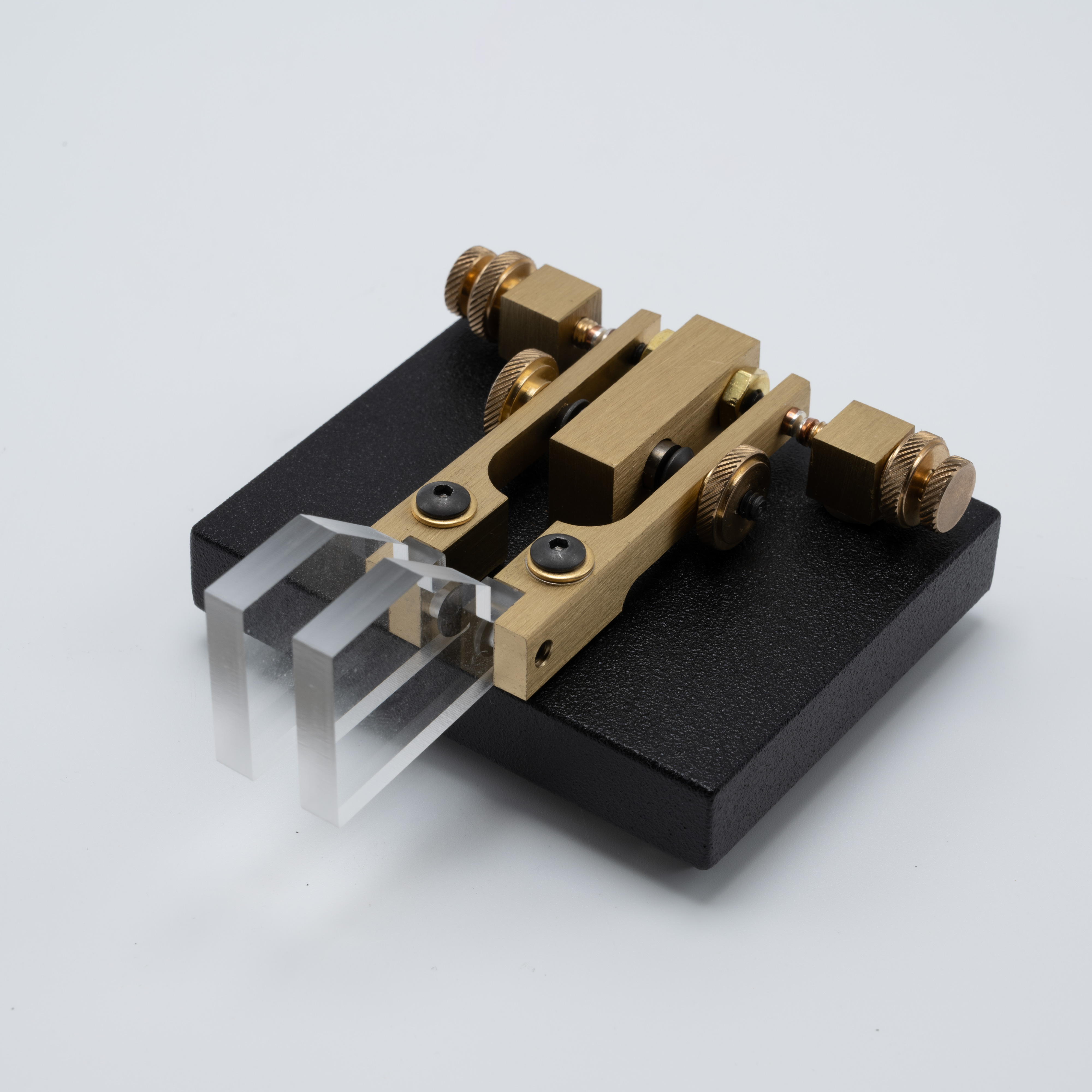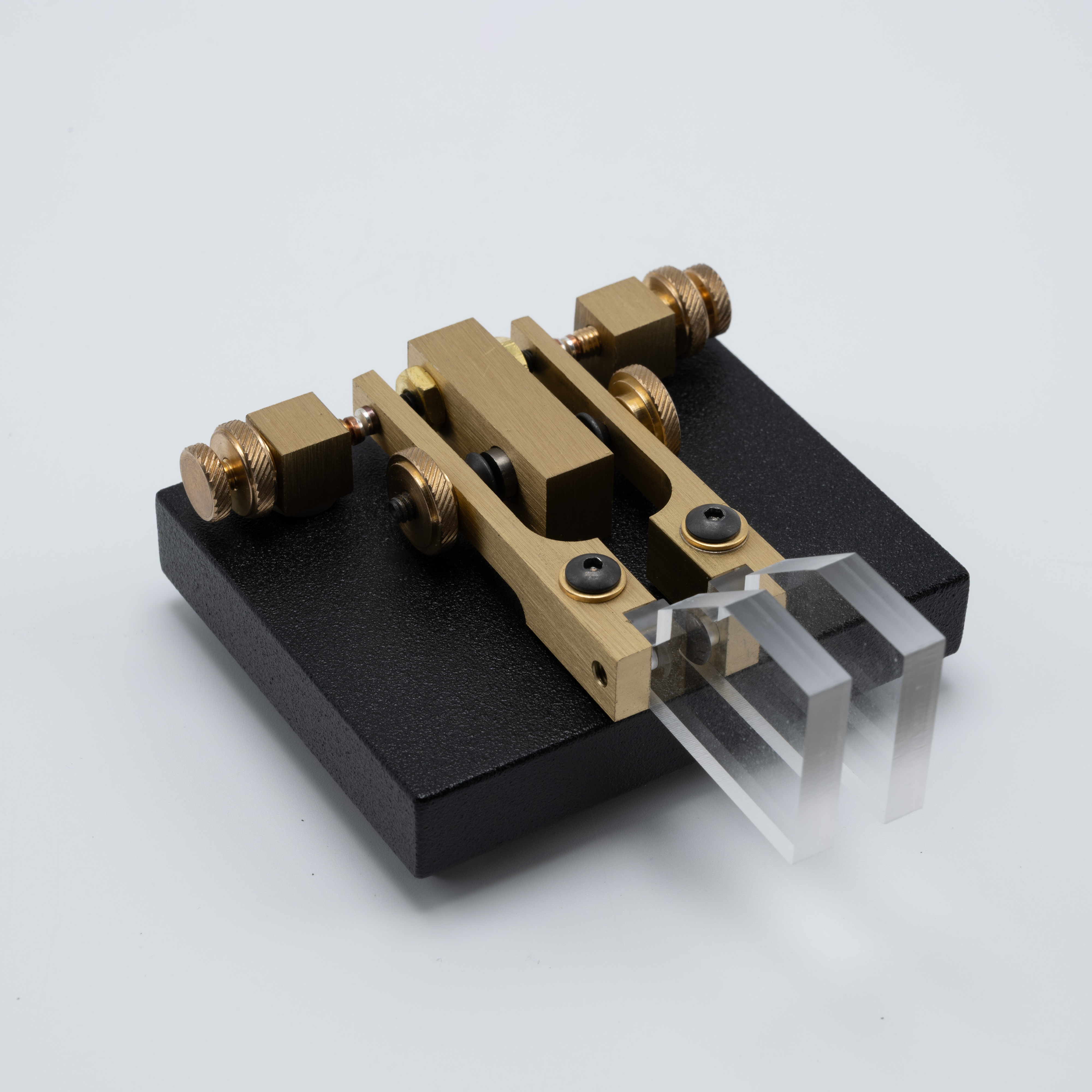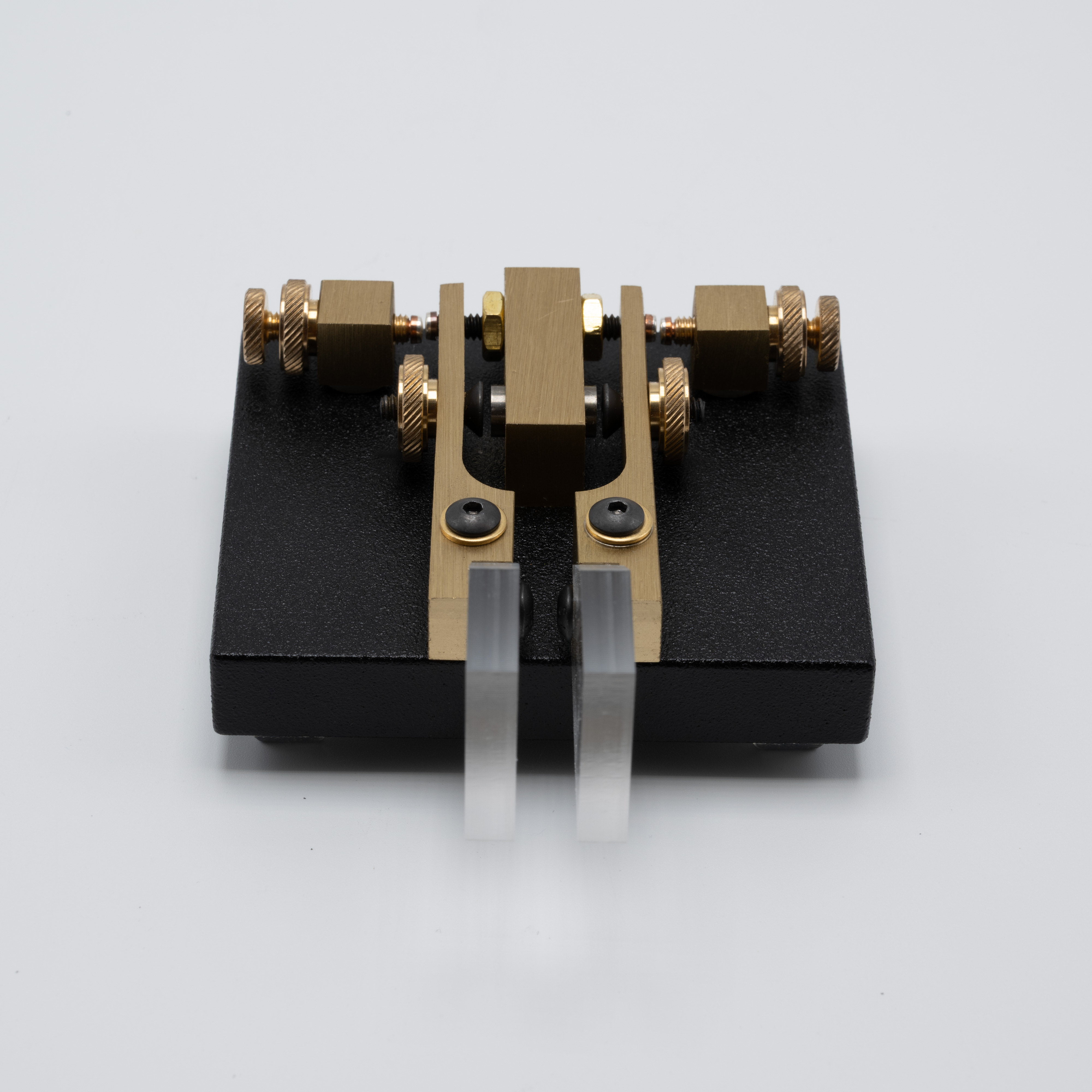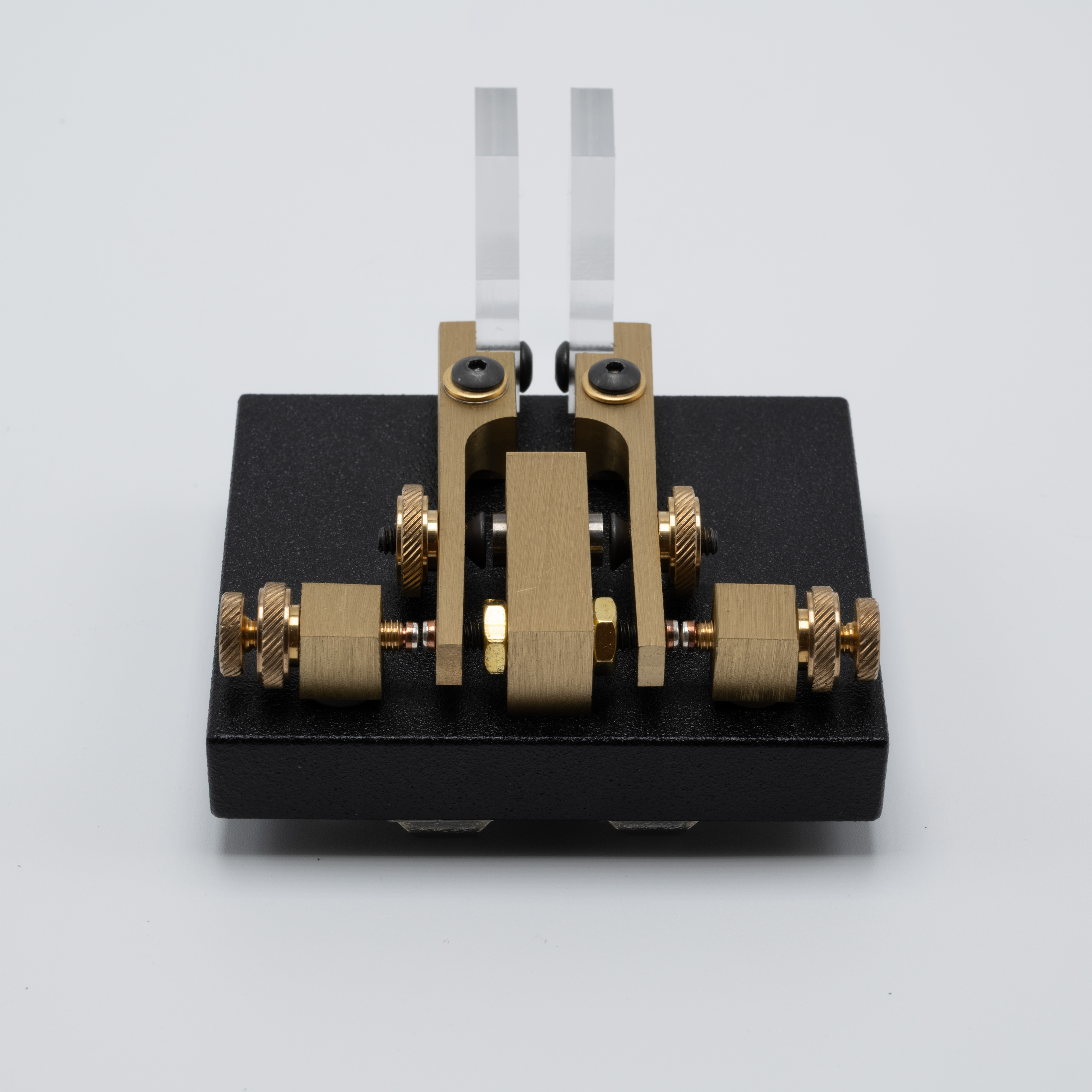 The Code Warrior Jr. was introduced by Vibroplex in 2000 while the company was located in Mobile, Alabama under S. Felton “Mitch” Mitchell’s ownership. The Code Warrior Jr. is based on a key designed by Wayne Smith, K8FF, which won the 1997 NorCal Design Contest. Described as a “QRP” key, obviously due to its small size, the Code Warrior Jr. uses brass components mounted onto a black powder coated base. Paddle tension is magnetic leveraging two small magnets mounted into the sides of the center block and screws inserted into the paddle arms. The paddle arms rotate around two bronze bearings affixed to two screws which then attach the arm and bearing assembly to the steel base.