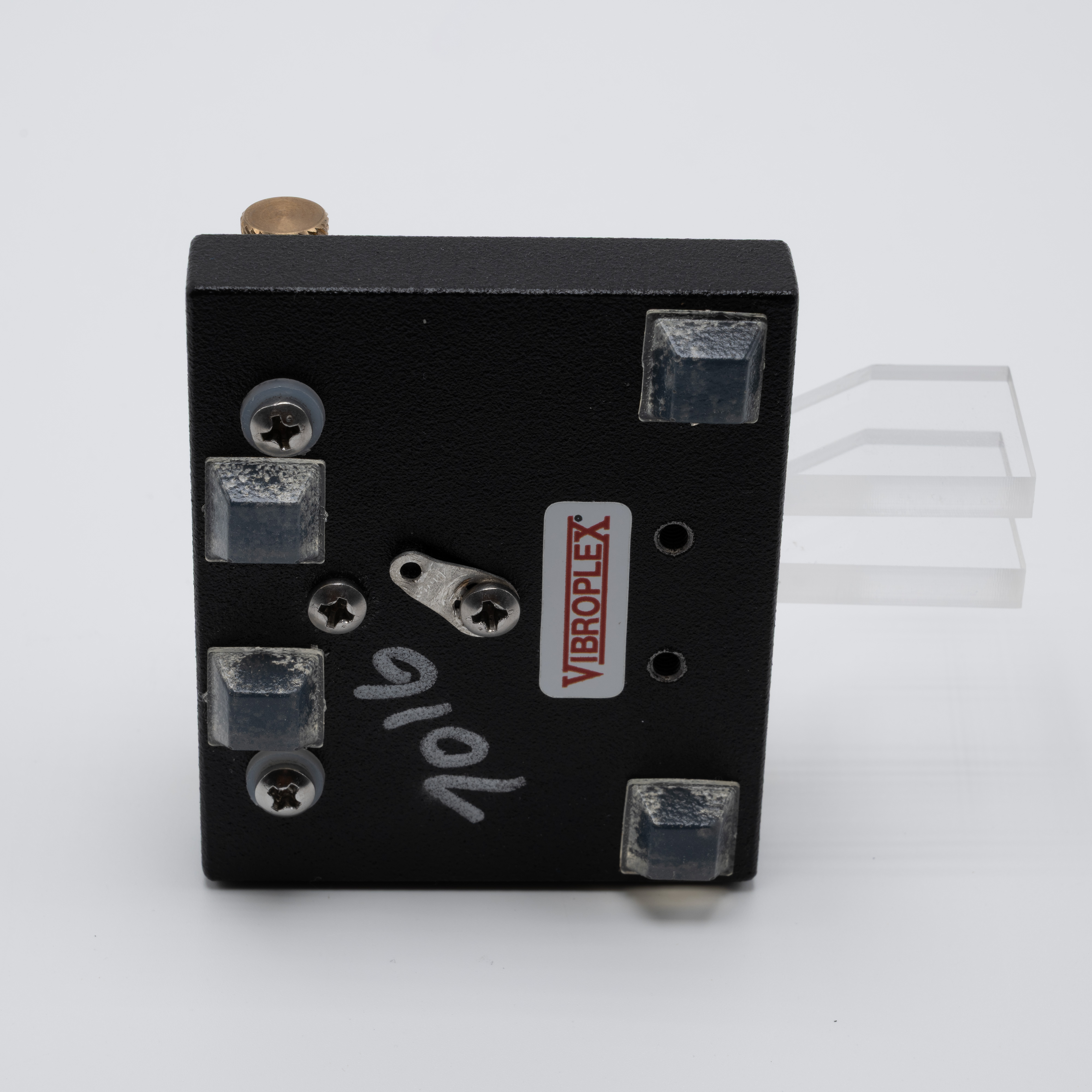 Alabama-era Code Warrior Jr. “Chrome Warrior” models had “VIBROPLEX” and a serial number engraved into the center block and a brushed chrome base. All models from Tennessee include a simple VIBROPLEX sticker and hand-written serial number on the underside of the base.